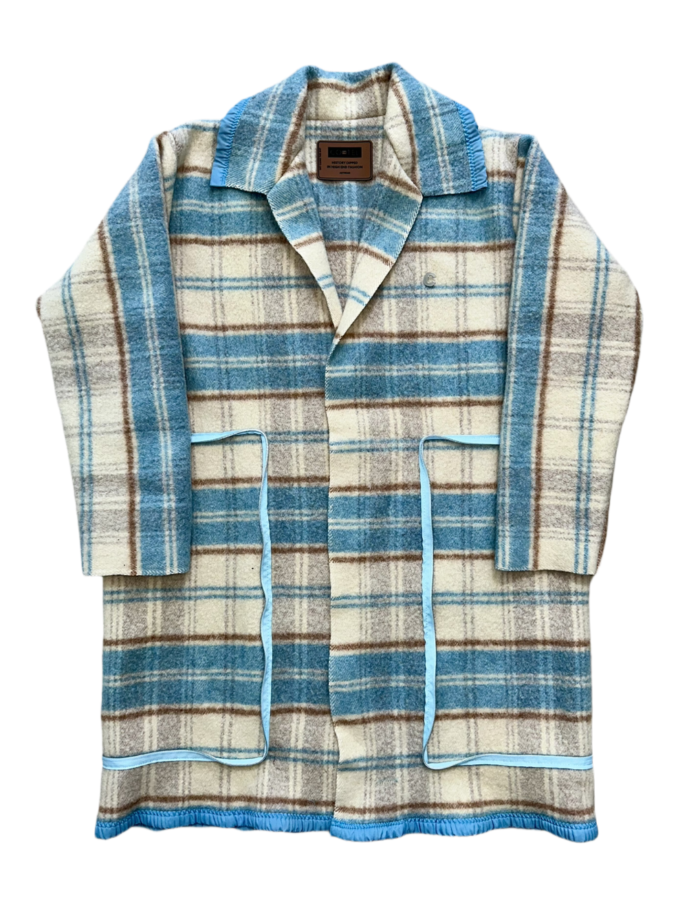 Constructed from vintage woolen knit fabric, this coat presents a softened plaid reimagined through a relaxed silhouette. Sandy beige and warm brown stripes intersect with bands of baby blue, their muted tones balanced by the coat’s easy movement and soft hand. The medium weight allows warmth without bulk, making it a versatile piece for layering or wearing on its own. Finished with a baby blue zipper.