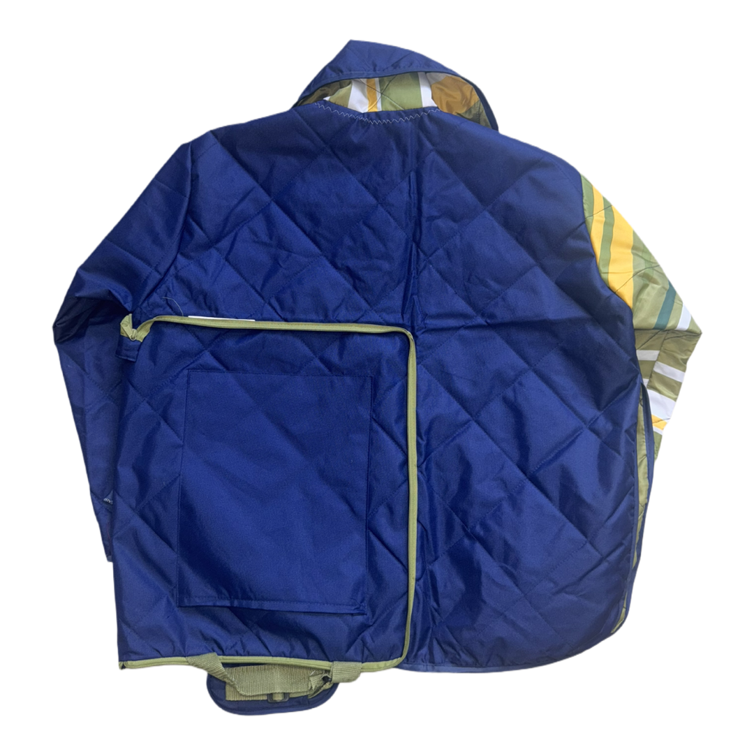 Constructed from a vintage quilted fabric, this pullover coat contrasts deep navy panels with a single striped sleeve in green, yellow, and white, creating a bold asymmetry. The diamond quilted body lends structure, while the striped arm adds a playful, retro edge.