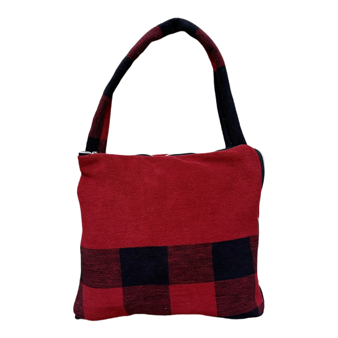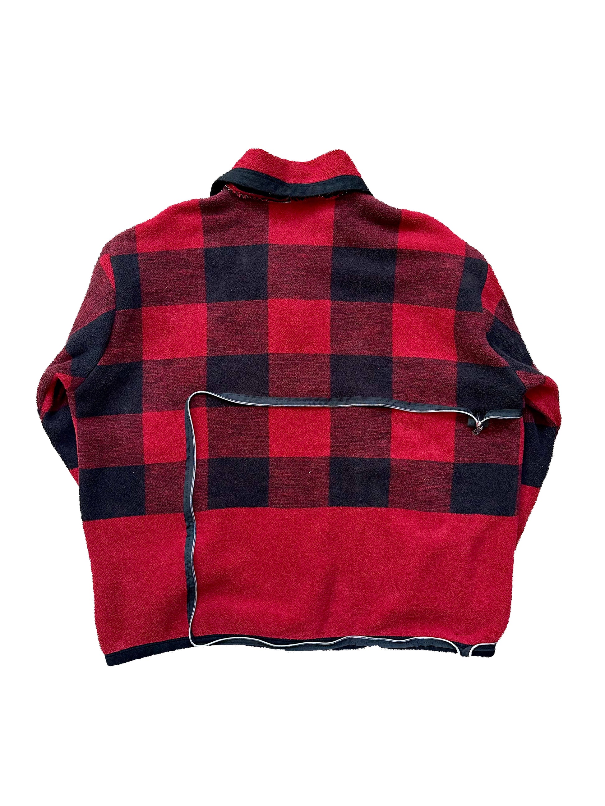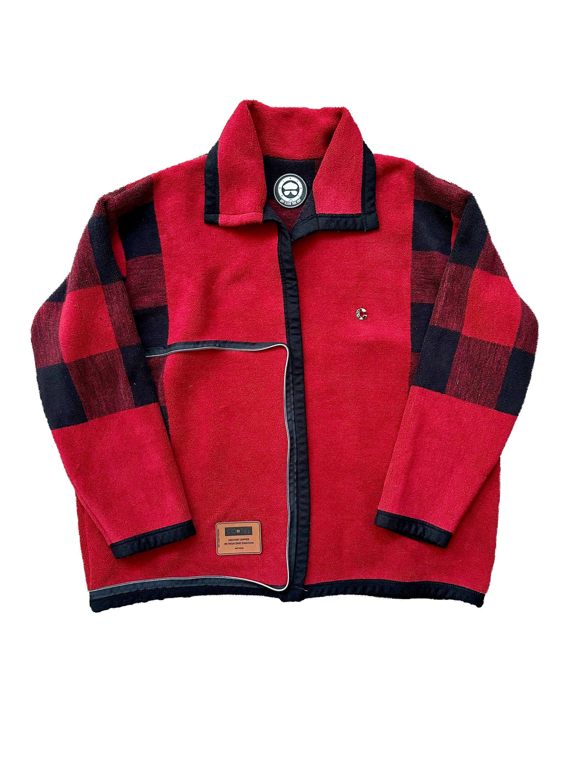 Constructed from vintage brushed fabric, this coat pairs bold red with deep black in a softened plaid that nods to classic lumberjack style. The slightly faded finish gives it a lived-in character, while the clean body contrasts with checkered sleeves for balance and depth. Finished with a black zipper.