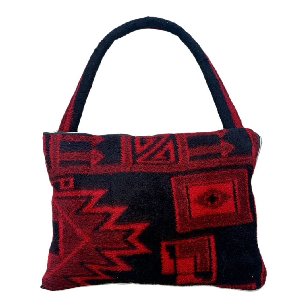 Constructed from a vintage brushed knit fabric, this trench tote merges bold red and deep black into a striking geometric pattern. The sharp arrow motifs bring structure and energy, while the brushed texture softens the impact with a cozy hand feel. Finished with a black zipper.