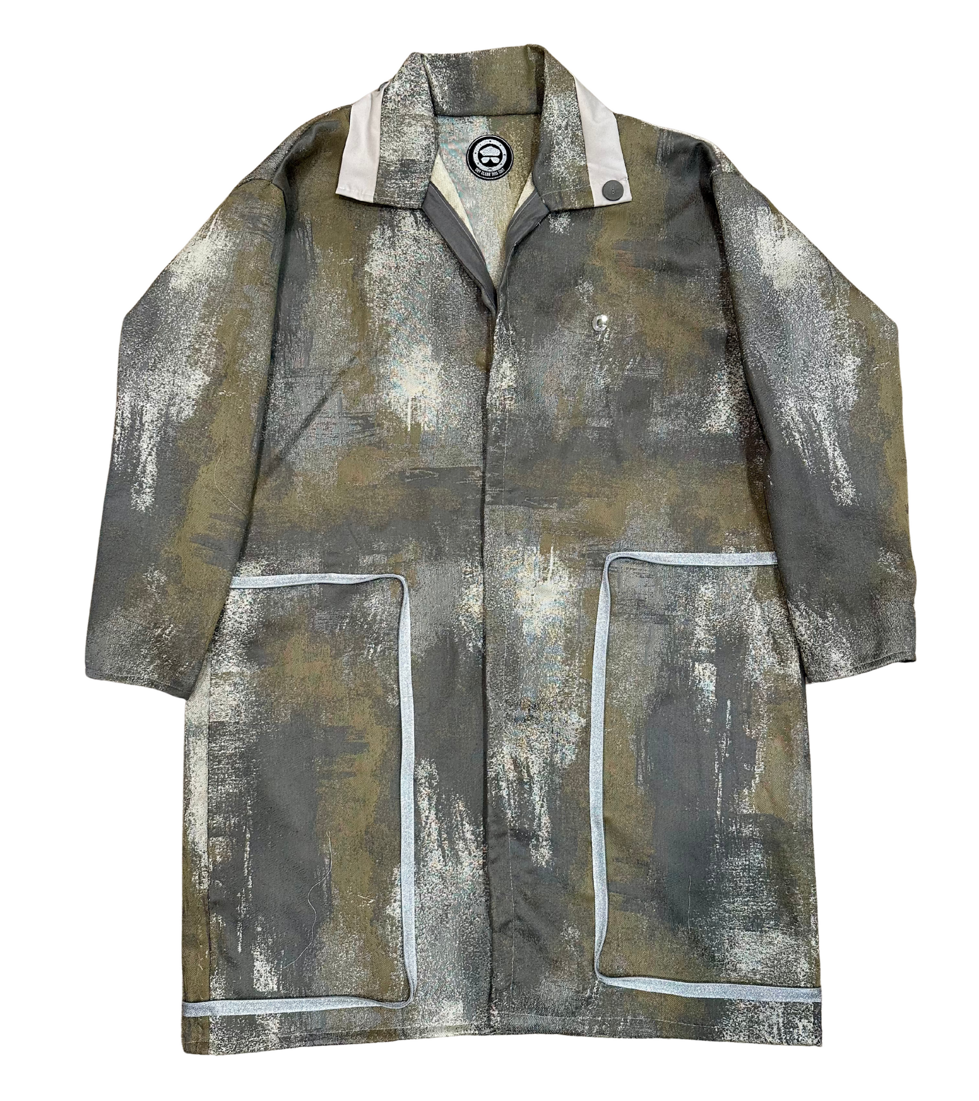 Constructed from vintage woven fabric, this coat carries a light, airy hand with a brushed wash of soft greys, charcoal, off-white, and subtle metallic tones layered across the surface. The abstract, weathered pattern creates a painterly texture that shifts gently in the light, giving the piece a quiet, reflective character. Pale trim and the relaxed drape of the fabric keep the silhouette easy and versatile for layered wear. Finished with a silver grey zipper.