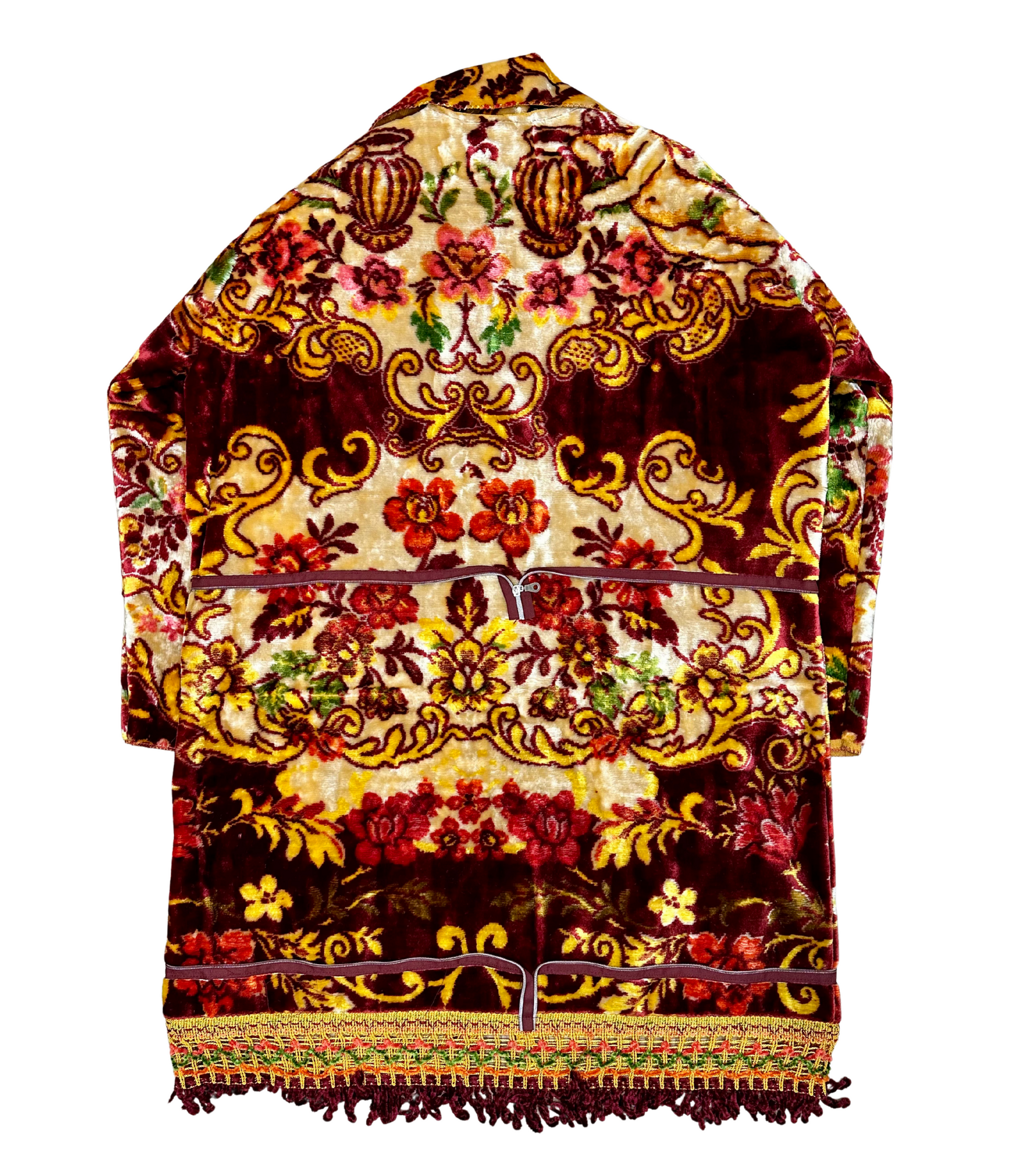 Constructed from vintage Italian velvet tapestry, this coat transforms rich florals into a deep, opulent statement piece. A warm burgundy base anchors golden leaves, marigold vines, and red blossoms, all rendered with the plush dimension and old-world clarity characteristic of midcentury Italian velvet. Panel variations along the sleeves introduce softer cream tones and additional floral motifs, adding layered visual interest. Textured woven banding and fringe along the hem frame the tapestry like a preserved textile artifact. The open-front construction allows the full pattern to be seen without interruption, giving the silhouette a museum-like presence. Finished with a burgundy zipper.