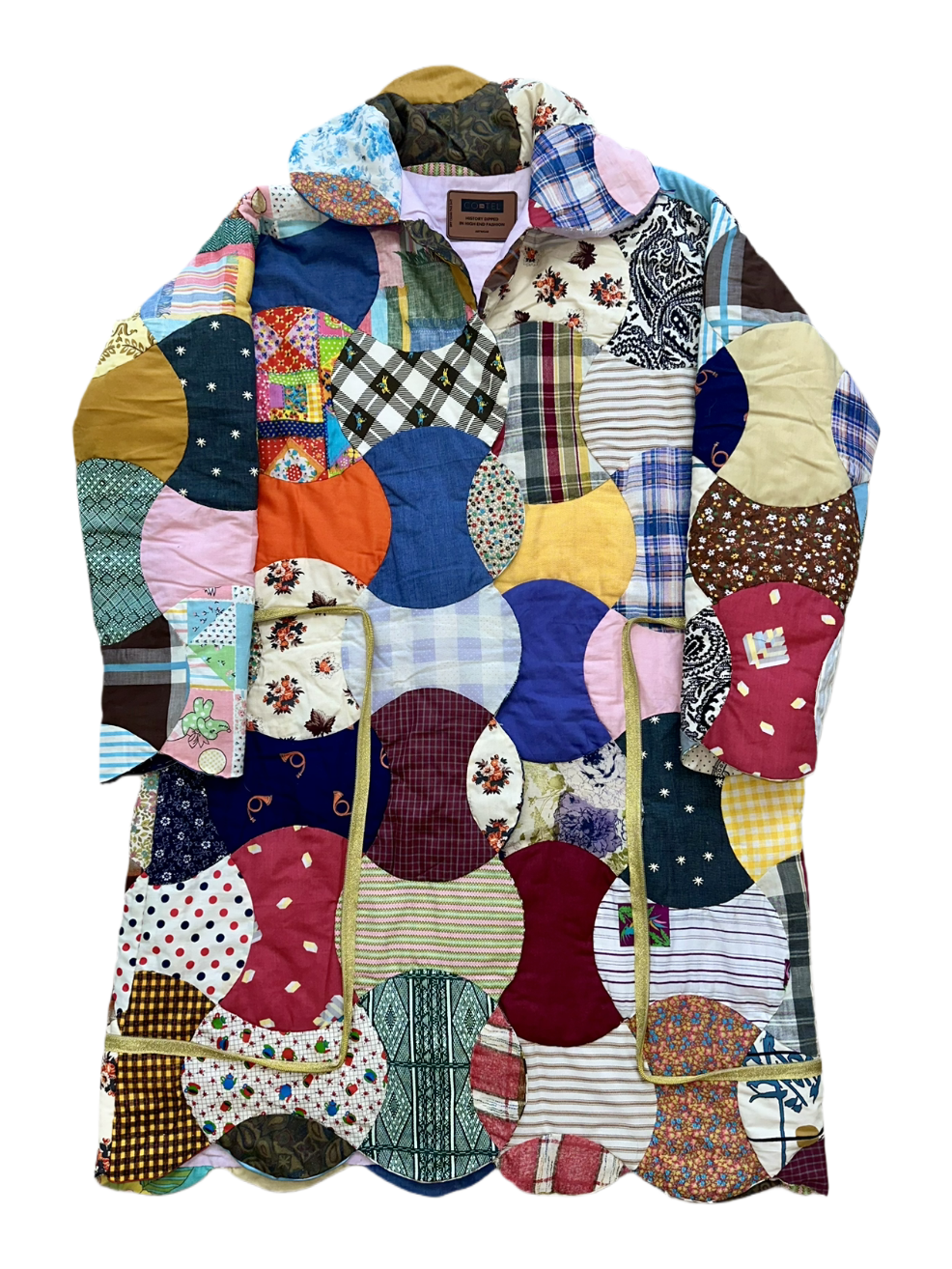 Constructed from an eclectic medley of vintage fabrics, this coat celebrates the artistry of quiltwork. Each circular patch tells its own story: florals, stripes, plaids, and geometrics stitched together into a vibrant mosaic. The lightweight yet substantial build offers comfort with structure, while the interior is lined in soft pastel pink cotton for contrast. A golden zipper traces the front, catching the light and framing the artwork in motion.