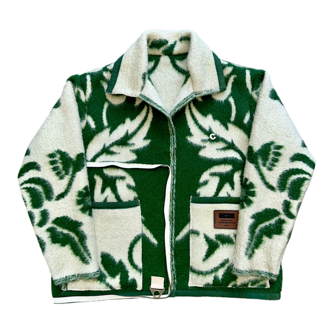 Constructed from vintage wool fabric sourced from China, this coat highlights a commanding palette of emerald green and off-white, arranged in oversized botanical motifs. The heavy wool provides exceptional warmth and structure, while the green trim delivers a seamless finish that frames the bold design. Carrying both strength and refinement, this piece transforms utilitarian warmth into wearable art. Finished with a cream zipper.