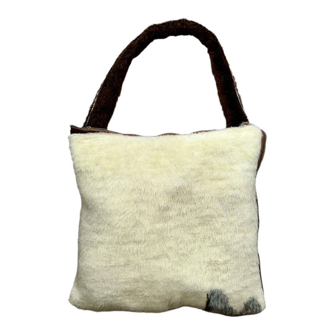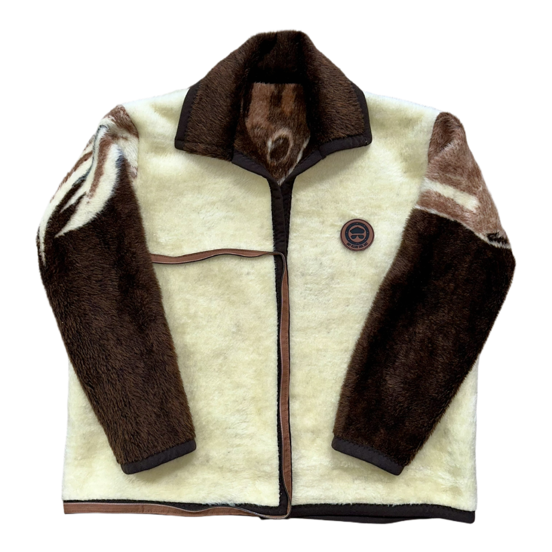 Constructed from a vintage brushed knit, this coat blends deep chocolate brown with soft cream, accented by natural patterning that feels organic and elemental. The tones recall firewood embers fading into ash, balanced with a tactile softness that makes the piece both rugged and comforting. Finished with a brown zipper.