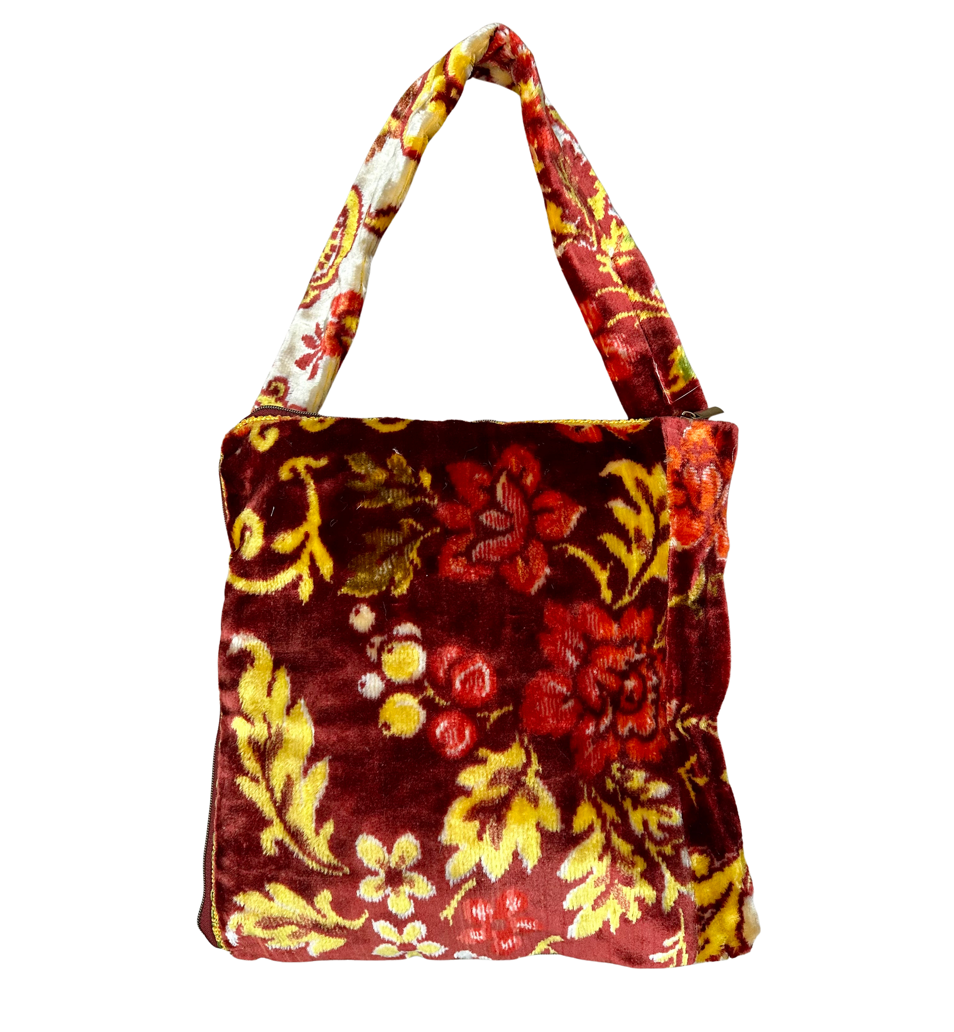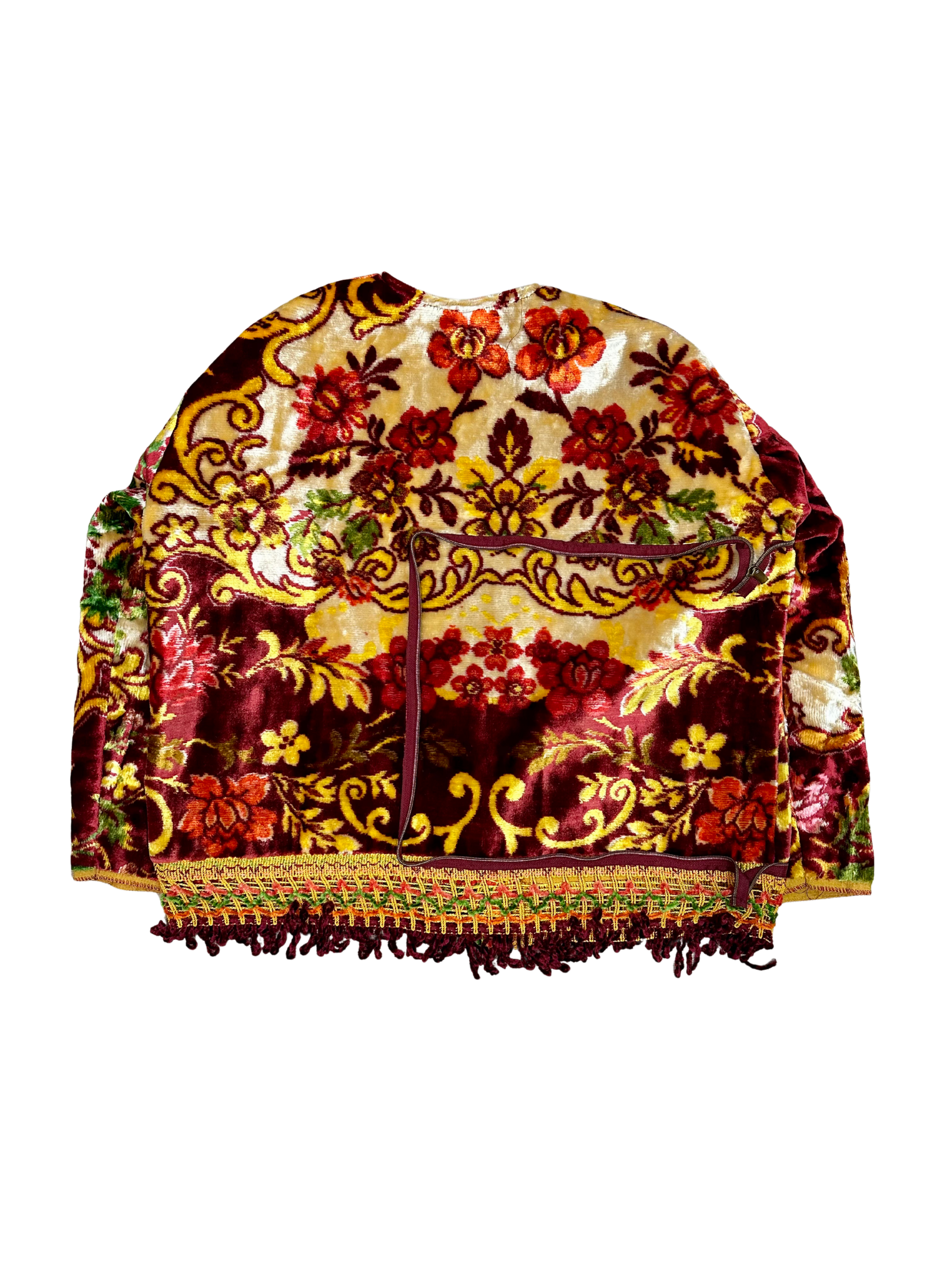 Constructed from vintage Italian velvet tapestry, this coat transforms rich florals into a deep, opulent statement piece. A warm burgundy base anchors golden leaves, marigold vines, and red blossoms, all rendered with the plush dimension and old-world clarity characteristic of midcentury Italian velvet. Panel variations along the sleeves introduce softer cream tones and additional floral motifs, adding layered visual interest. Textured woven banding and fringe along the hem frame the tapestry like a preserved textile artifact. The open-front construction allows the full pattern to be seen without interruption, giving the silhouette a museum-like presence. Finished with a burgundy zipper.