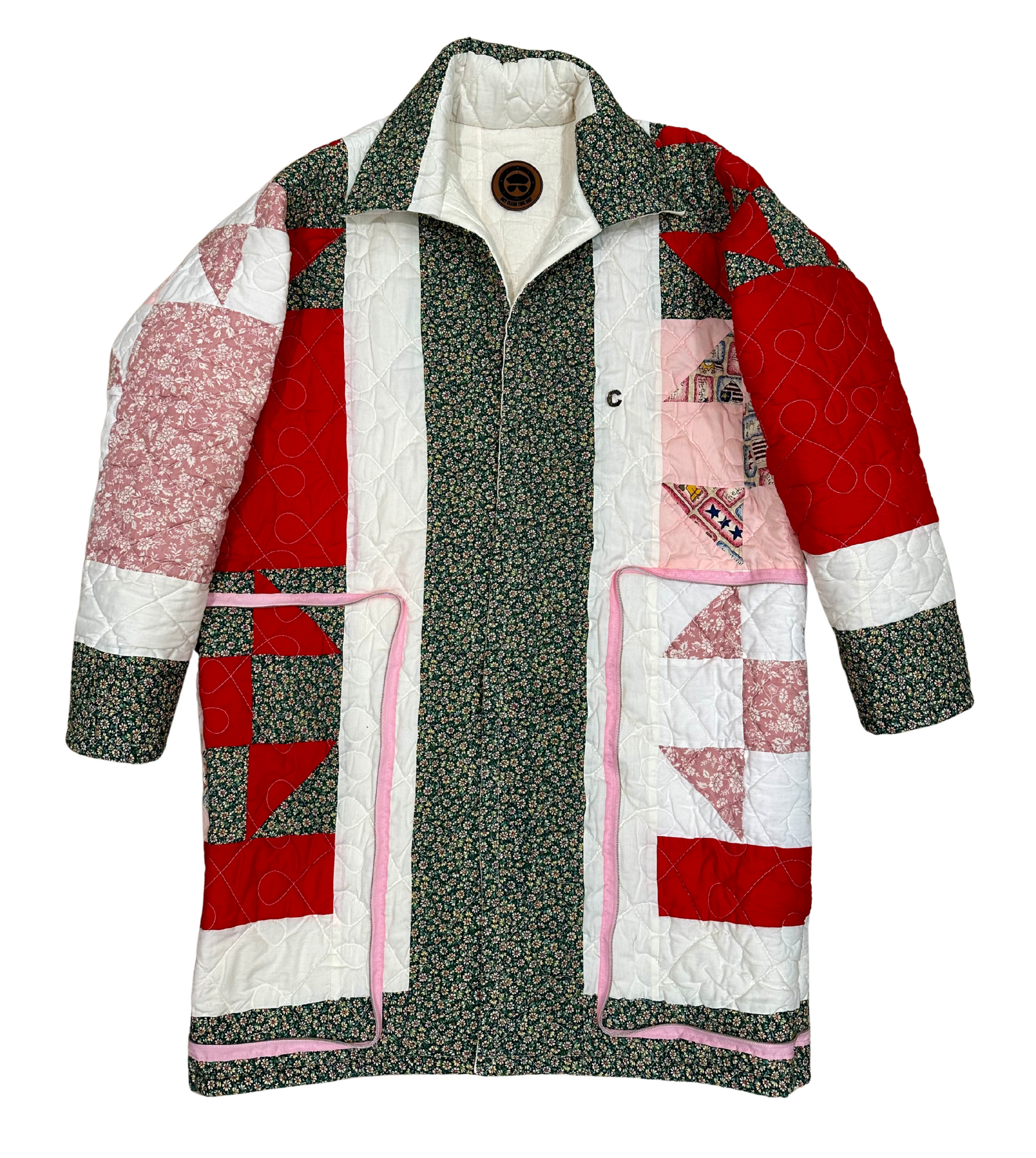 Constructed from vintage quilted fabric, this coat brings together floral green calicos, bright red blocks, soft pink patchwork, and crisp white panels in a composition of classic quilt motifs. Among the pieces are printed patches carrying the word freedom, adding a subtle narrative thread to the garment and echoing the history stitched into the quilt’s original life. The tiny florals, traditional shapes, and airy stitching create a sense of heritage and care. Finished with a pink zipper.