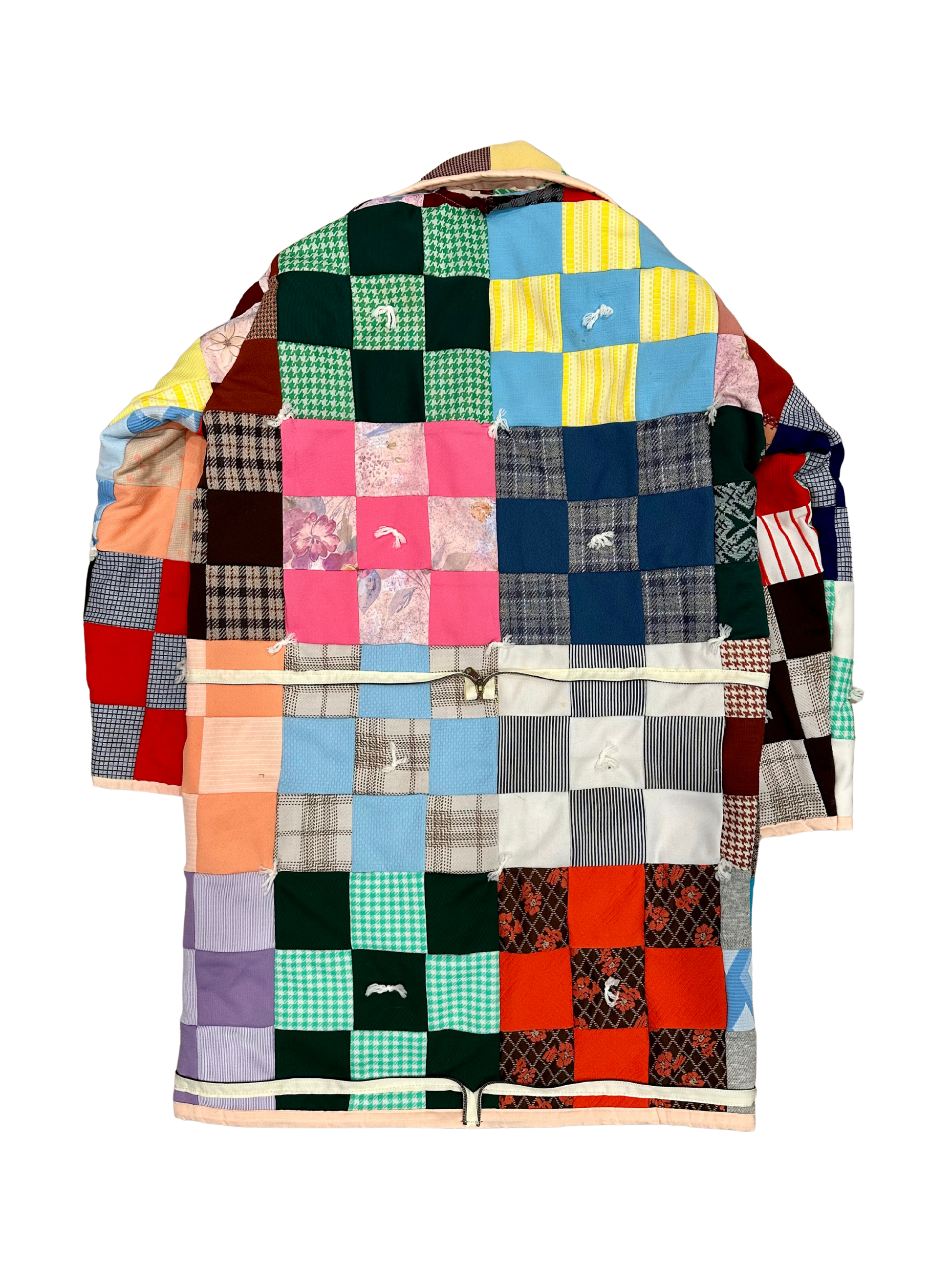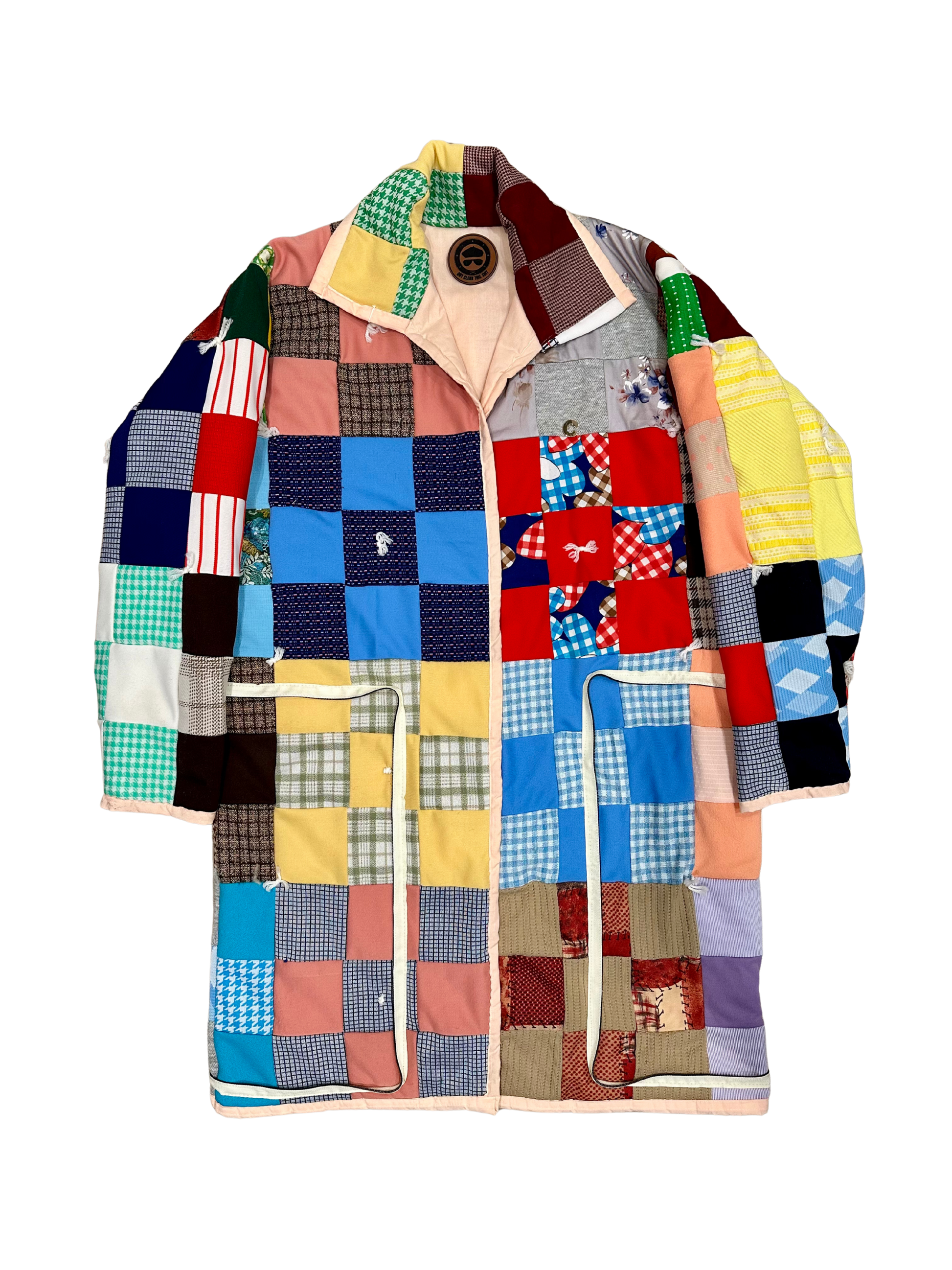 Constructed from vintage quilted fabric, this coat brings together an eclectic parade of patterns and colors, each square carrying its own history. Checks, ginghams, houndstooths, florals, stripes, and solids come together in a playful grid, creating a composition that feels gathered over time. Soft pastels meet bold primaries, giving the piece a lively, story-rich character while still holding a gentle, homespun warmth. The open-front design allows the full patchwork to unfold uninterrupted, framed by subtle cream trim that softens the silhouette. Finished with a cream zipper.